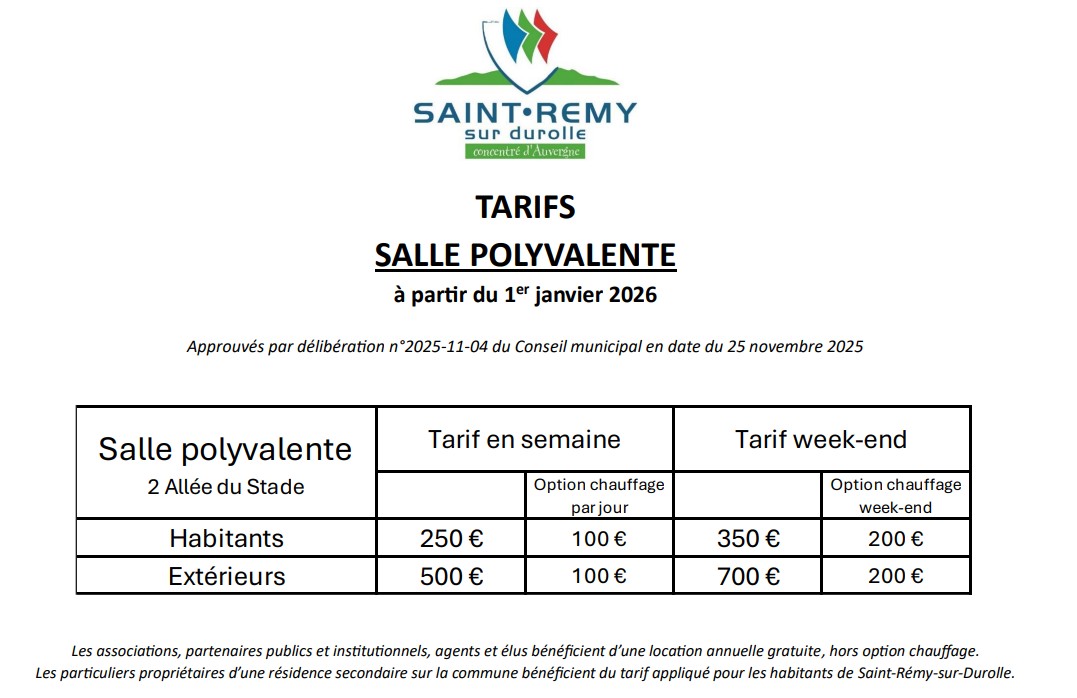 Le tarif de l’utilisation et le montant des cautions sont déterminés chaque année par le Conseil Municipal. Ils sont disponibles auprès du secrétariat de mairie.